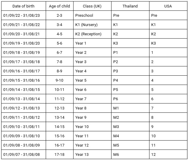 The following are the age groups and the classes they correspond with at UDIS for the 2025/2026 academic year: